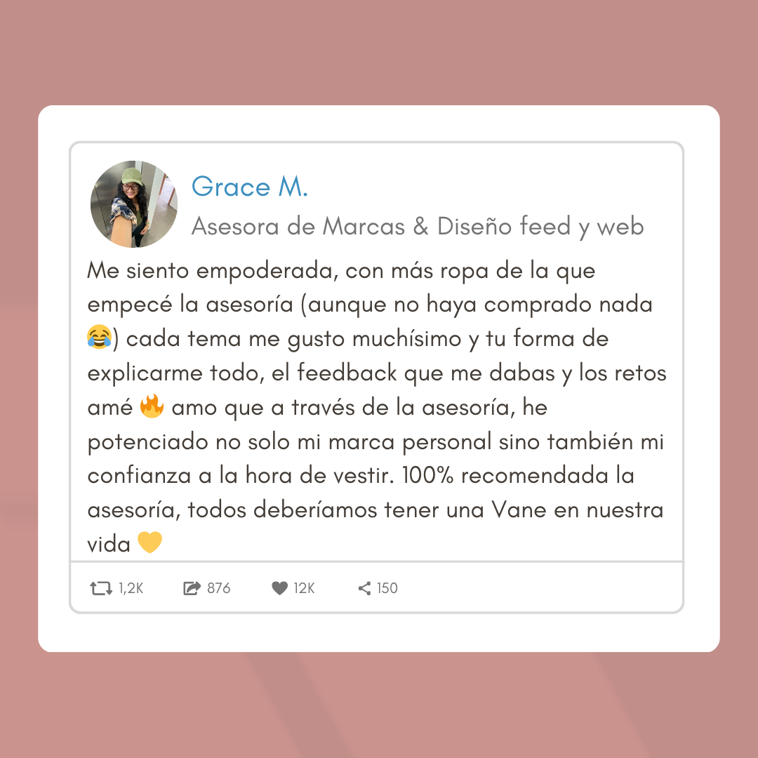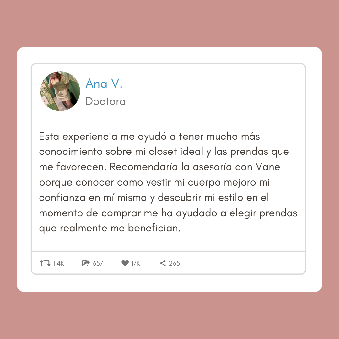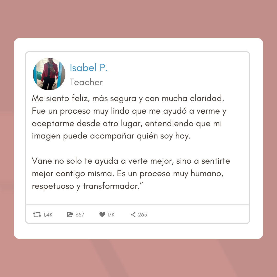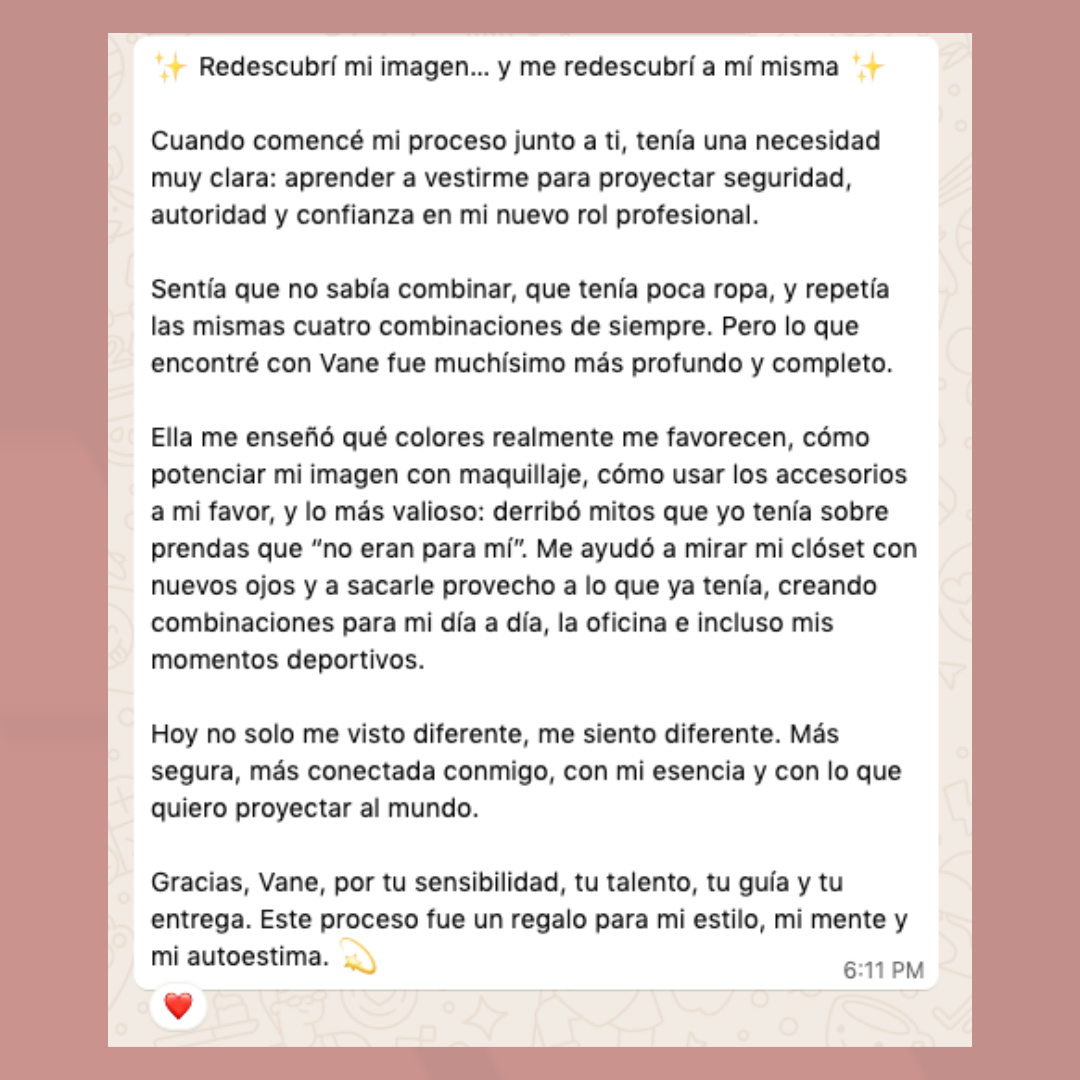 Hoy acompaño a mujeres a reconectar con su imagen como una herramienta de confianza, coherencia y posicionamiento, para que dejen de vestirse desde la duda y empiecen a vestirse desde el poder.